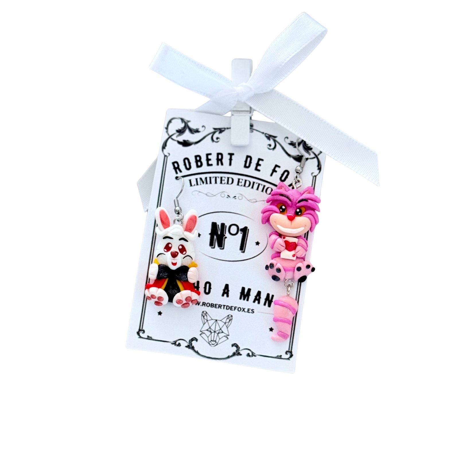 Estos originales pendientes inspirados en el Conejo Blanco y el Gato de Cheshire evocan un mundo mágico lleno de fantasía y color.