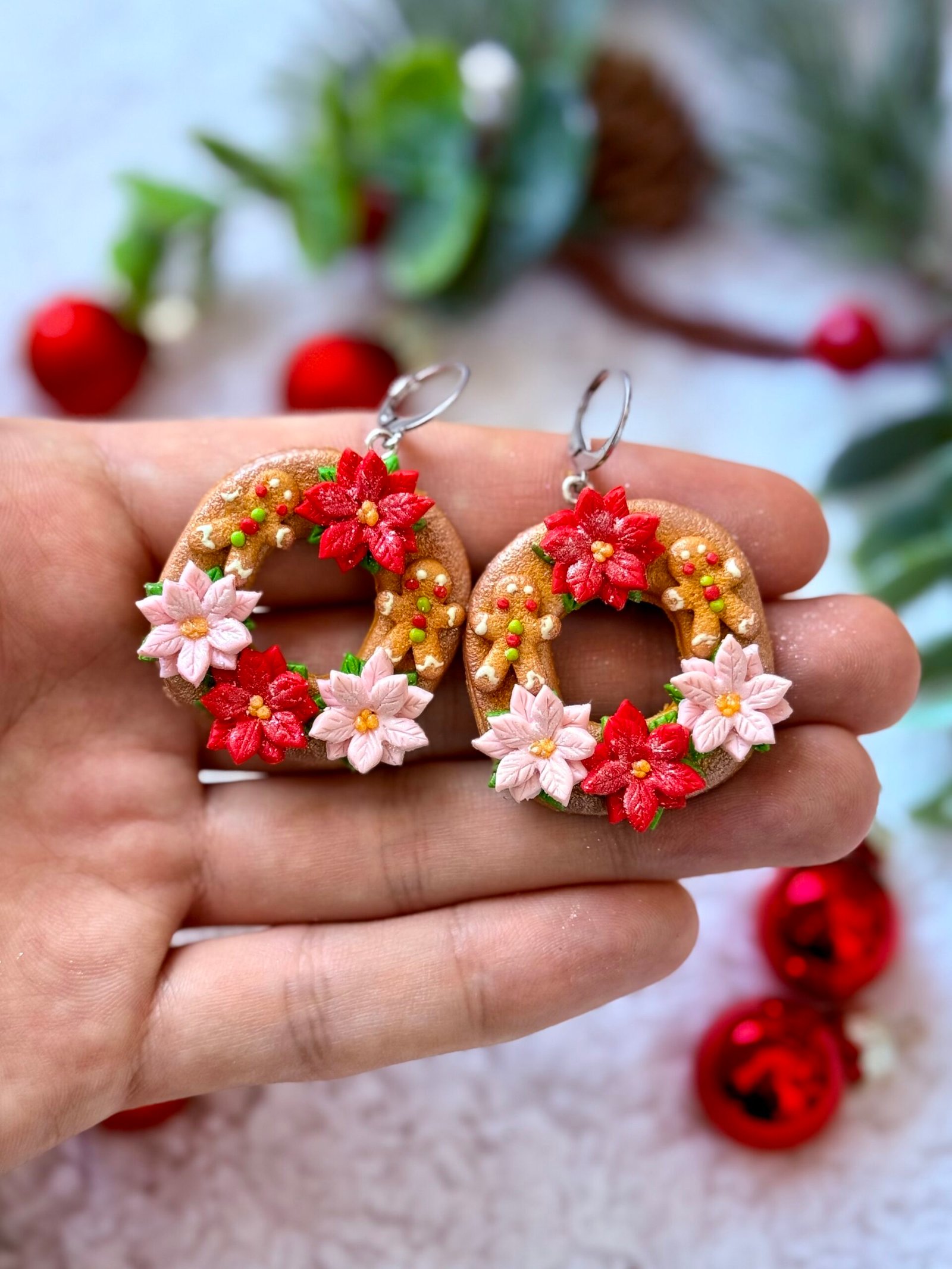 Pendientes navideños hechos a mano con forma de corona festiva, decorados con flores de Pascua y pequeños detalles que imitan el brillo de la Navidad.