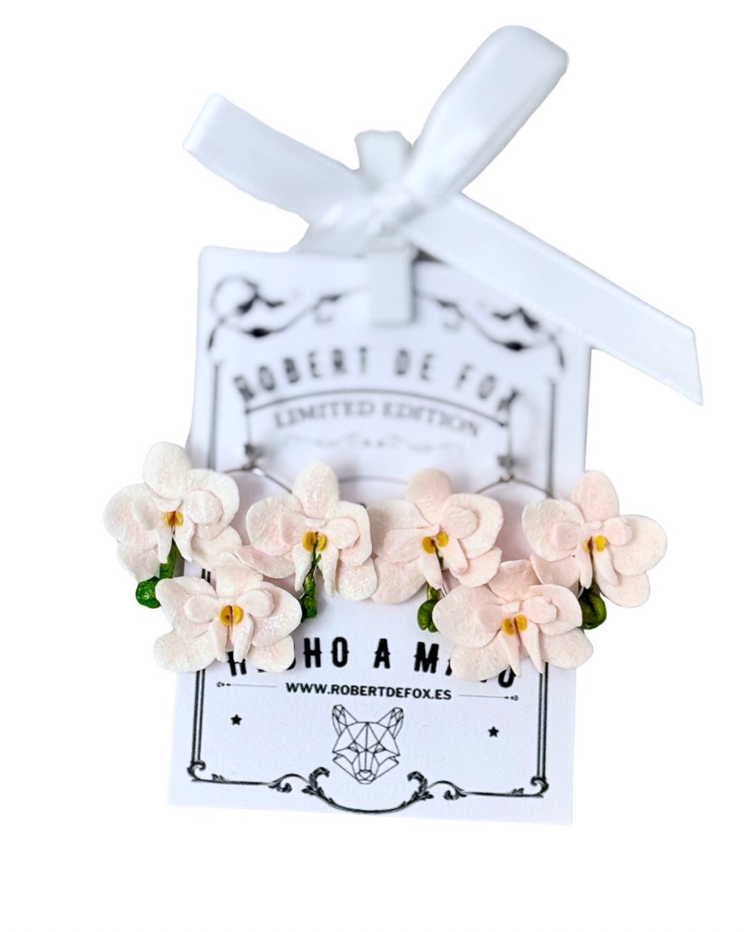 Estos delicados pendientes con flores de orquídea están creados cuidadosamente a mano con arcilla polimérica.