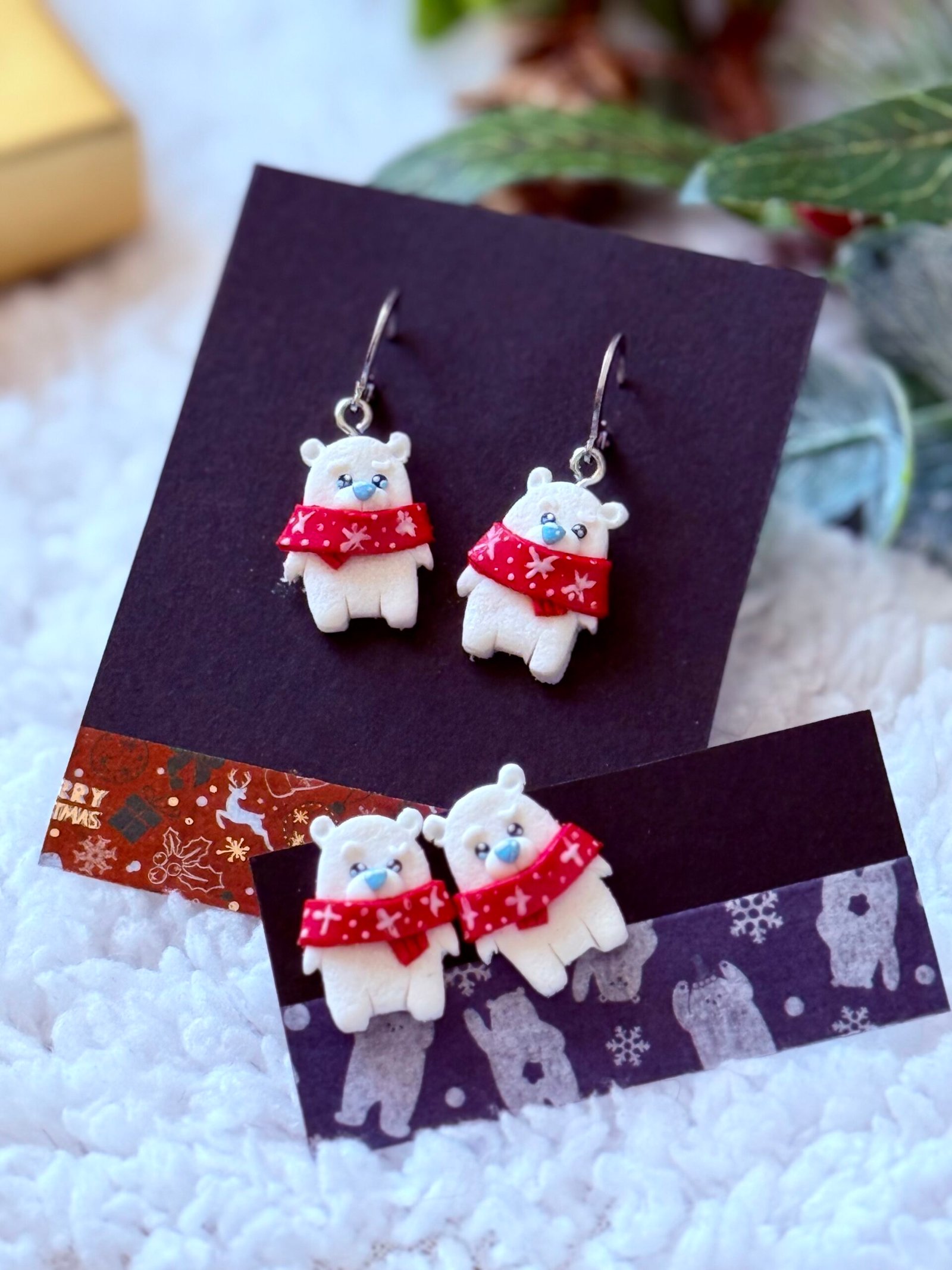 Cada par está completamente modelado y pintado a mano con arcilla polimérica, capturando cada pequeño detalle del osito y su bufanda navideña.