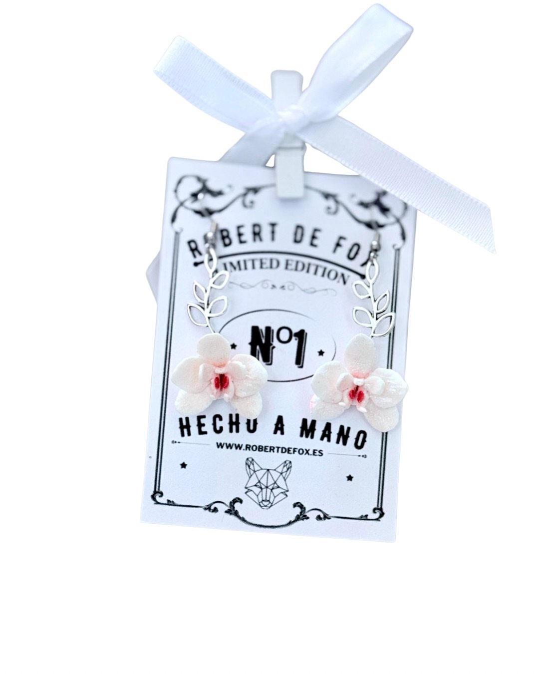 Estos pendientes combinan una orquídea blanca modelada a mano con un fino adorno metálico en forma de ramitas y hojas, creando un estilo natural y sofisticado al mismo tiempo.