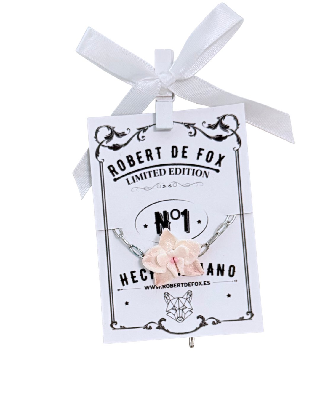 Esta pulsera destaca por su orquídea blanca/rosa modelada a mano, una a una, en arcilla polimérica, cuidando cada pequeño detalle para lograr un acabado fino y natural.