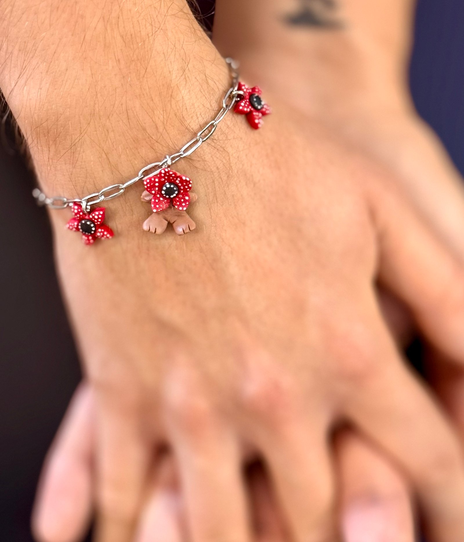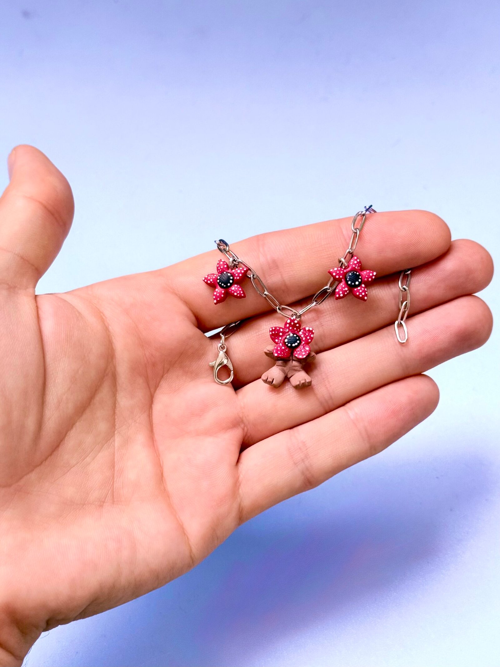 Pulsera artesanal con colgantes Demogorgon y flores rojas, montada sobre cadena metálica resistente.